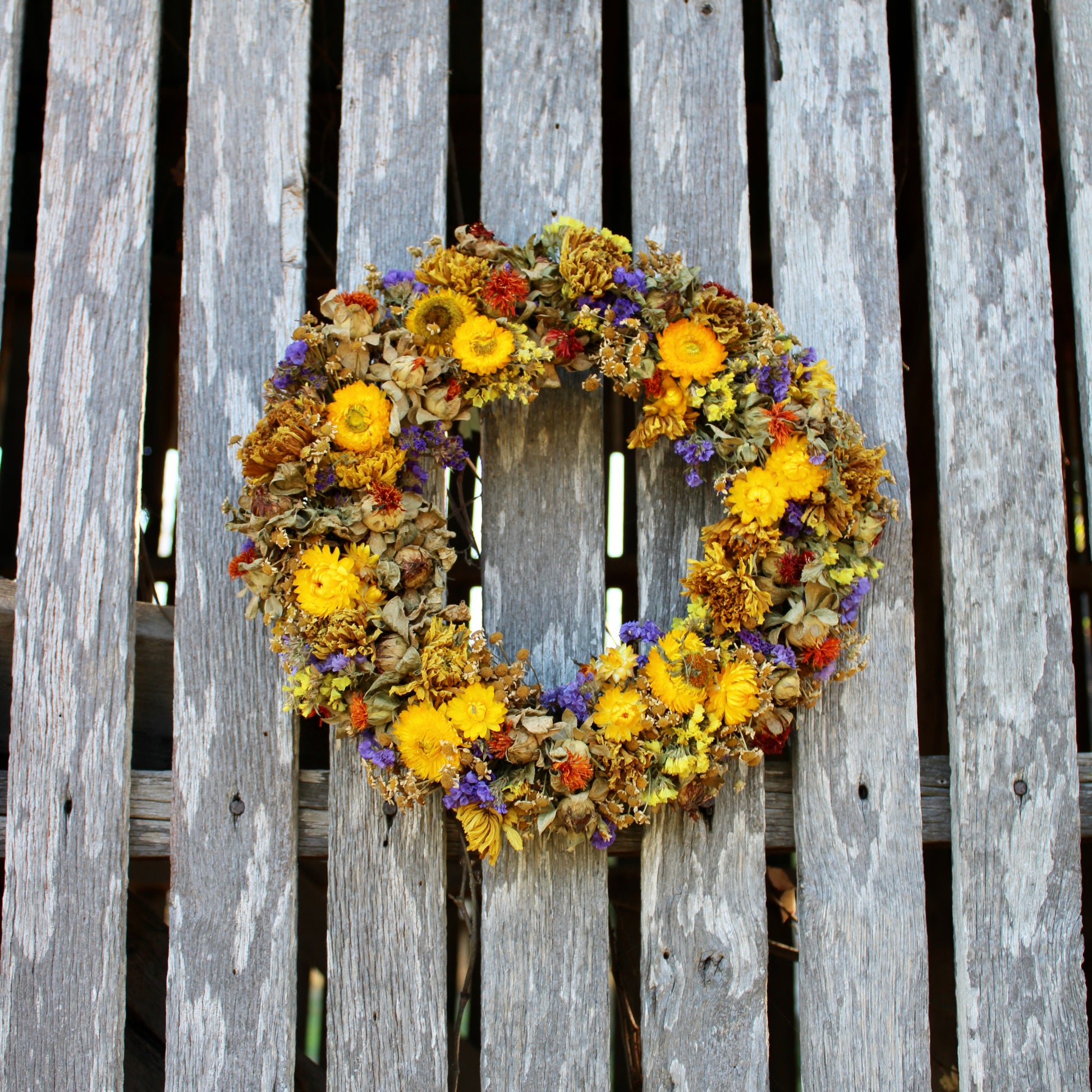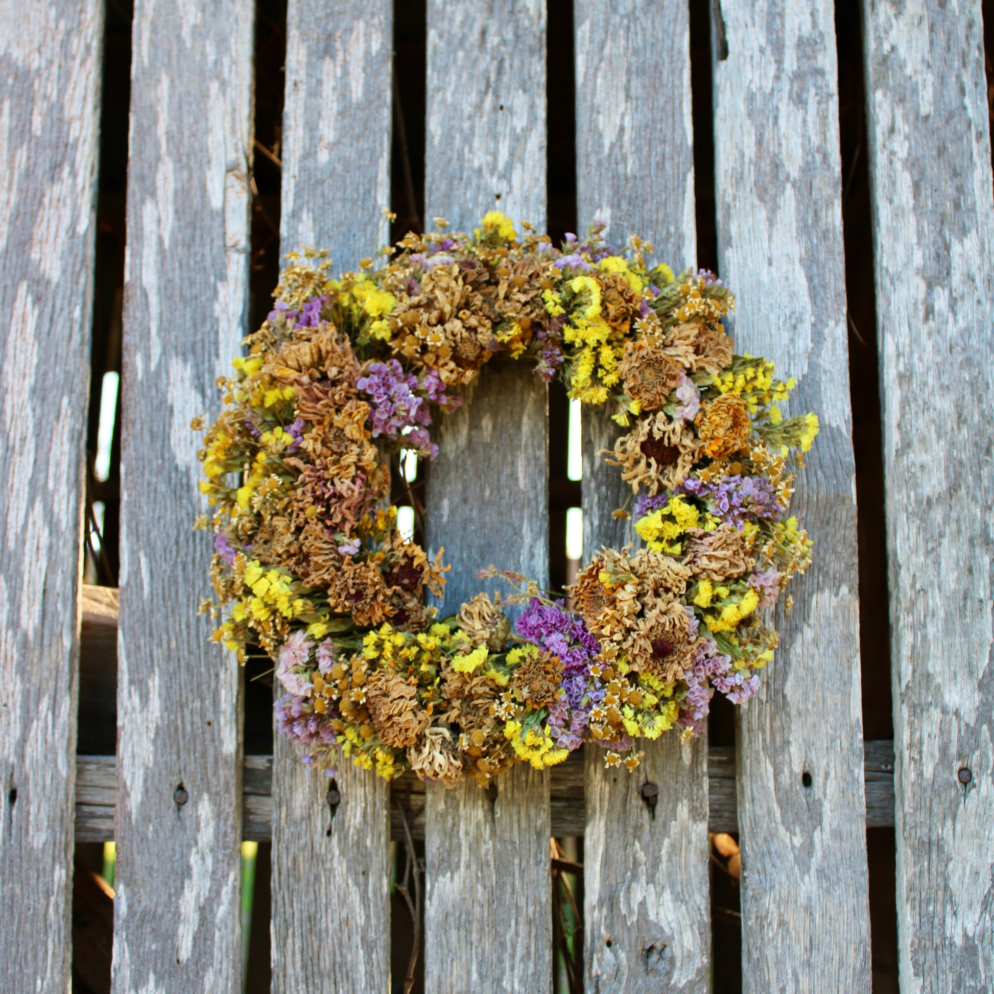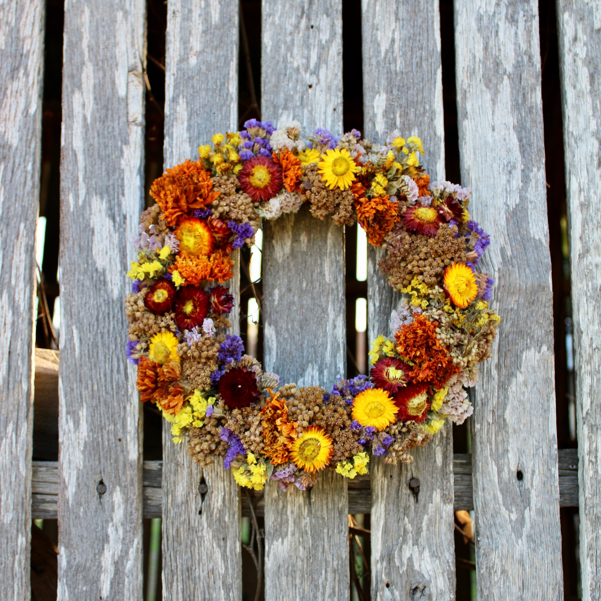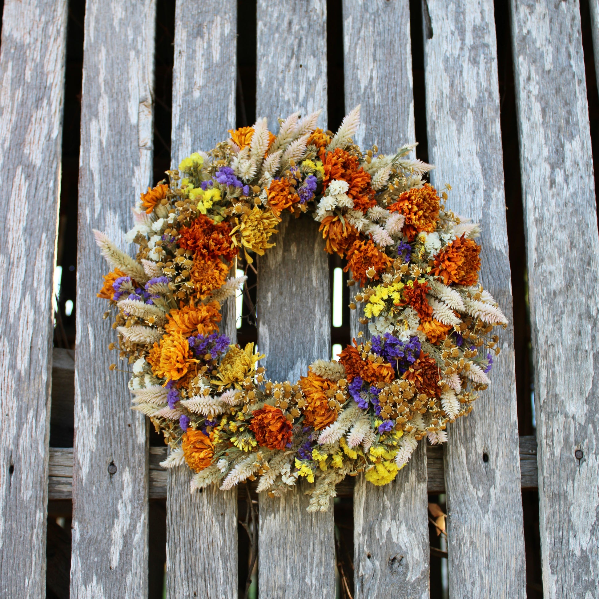 A combination of zinnia, statice, celosia, strawflower, marigold, and safflower. Dries, designed, and packaged by hand.