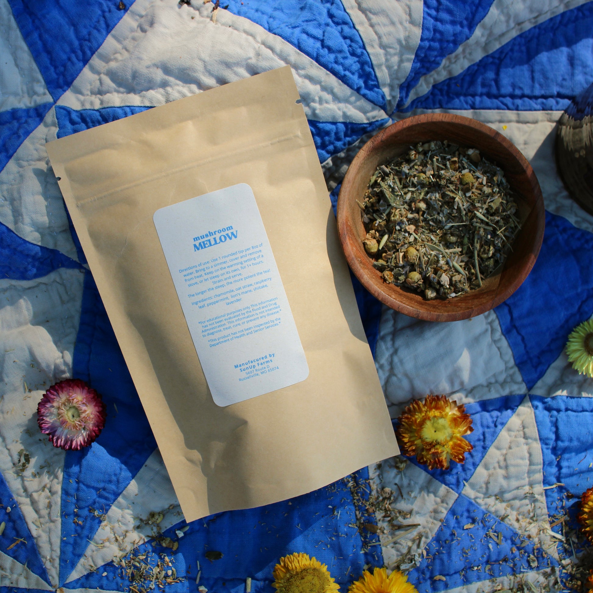Ingredients: oat straw, chamomile, raspberry leaf, peppermint, lavender, lion's mane, shiitake